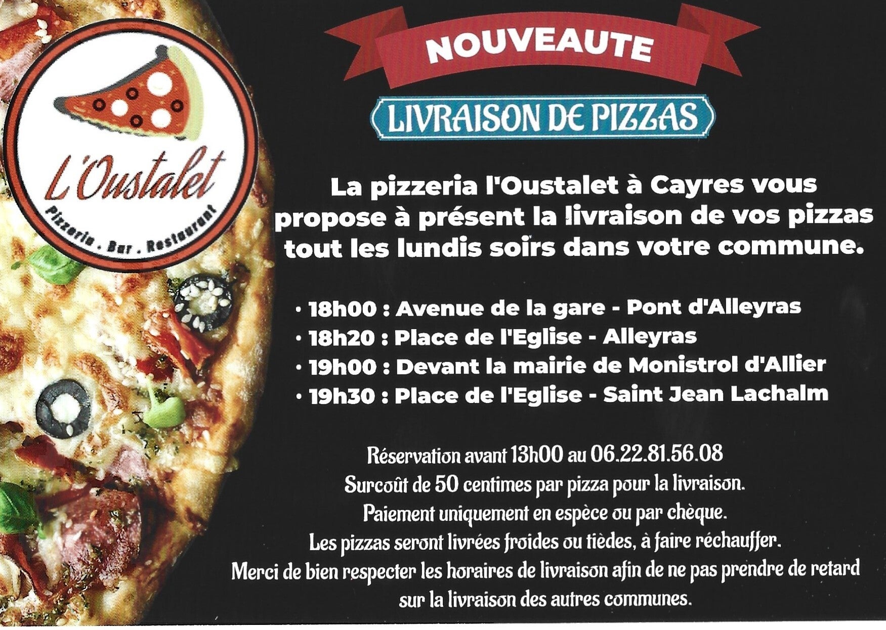 Nous proposons également la livraison de vos pizzas le lundi soir à Alleyras, Monistrol d'allier et St Jean Lachalm.
